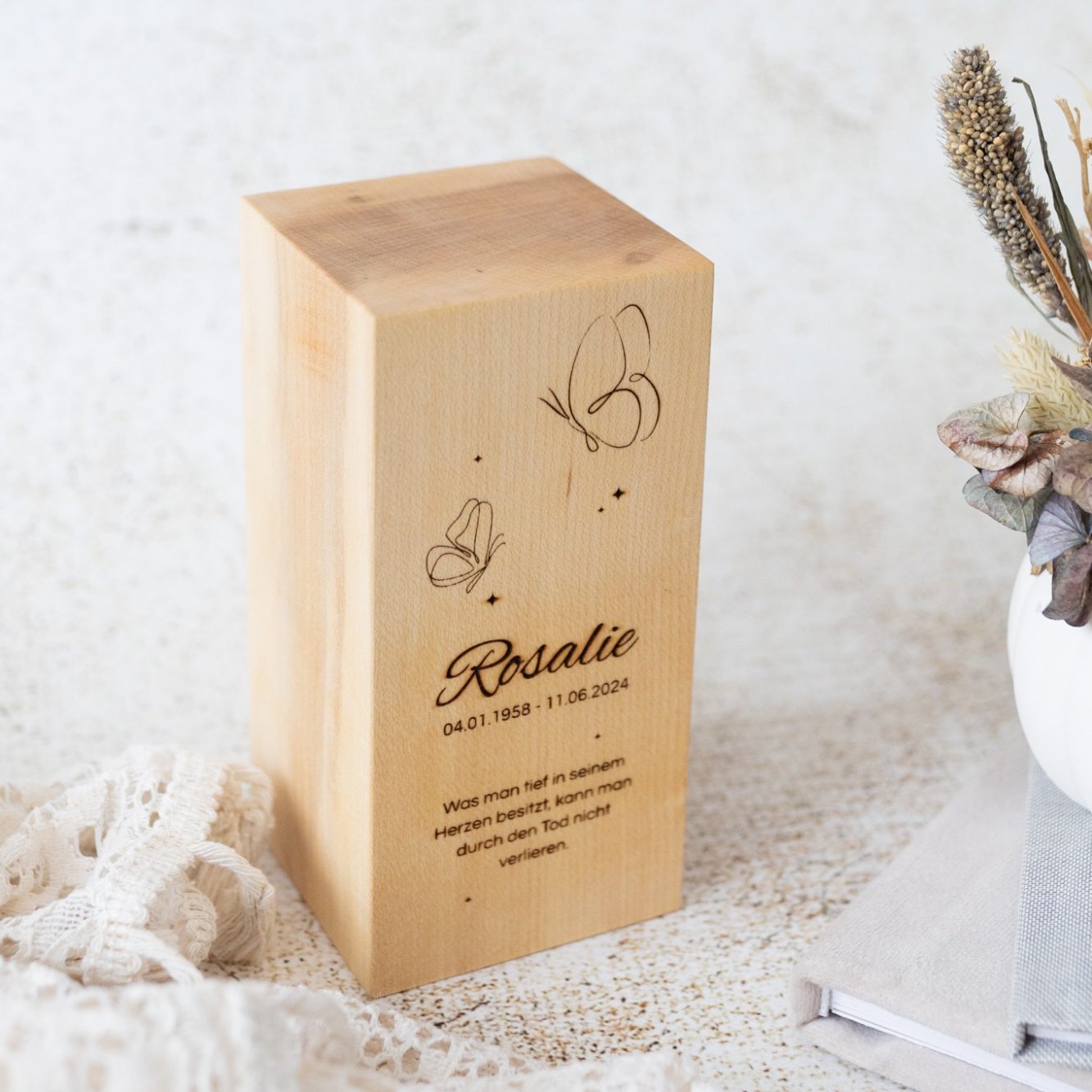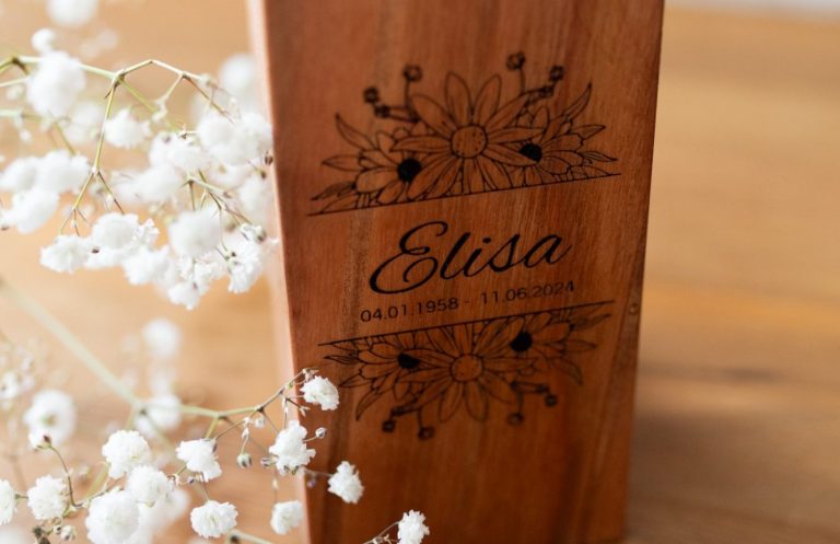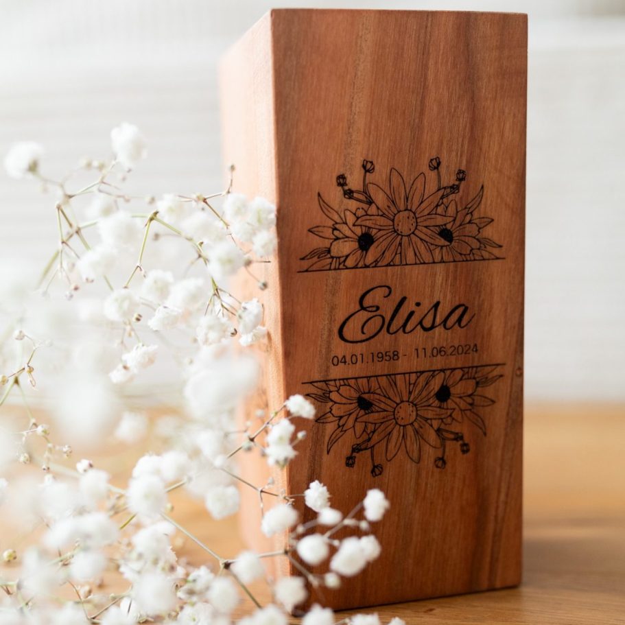 Unsere elegante Gedenkurne aus Ahornholz inkl. persönlicher Gravur.
