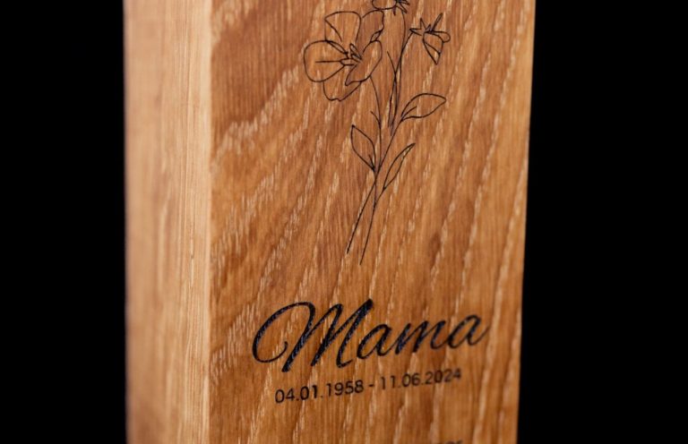 Unsere elegante Gedenkurne aus Eichenholz inkl. persönlicher Gravur.