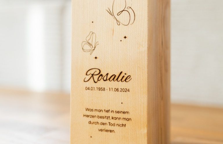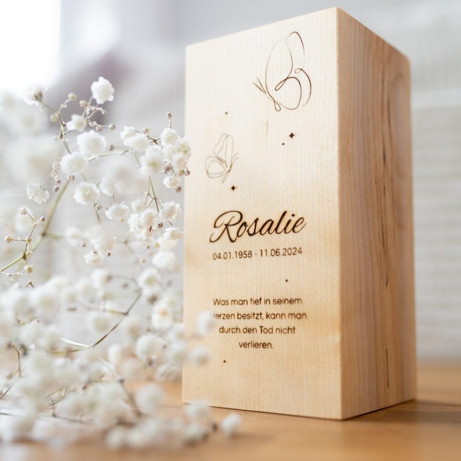 Unsere elegante Gedenkurne aus Ahornholz inkl. persönlicher Gravur.