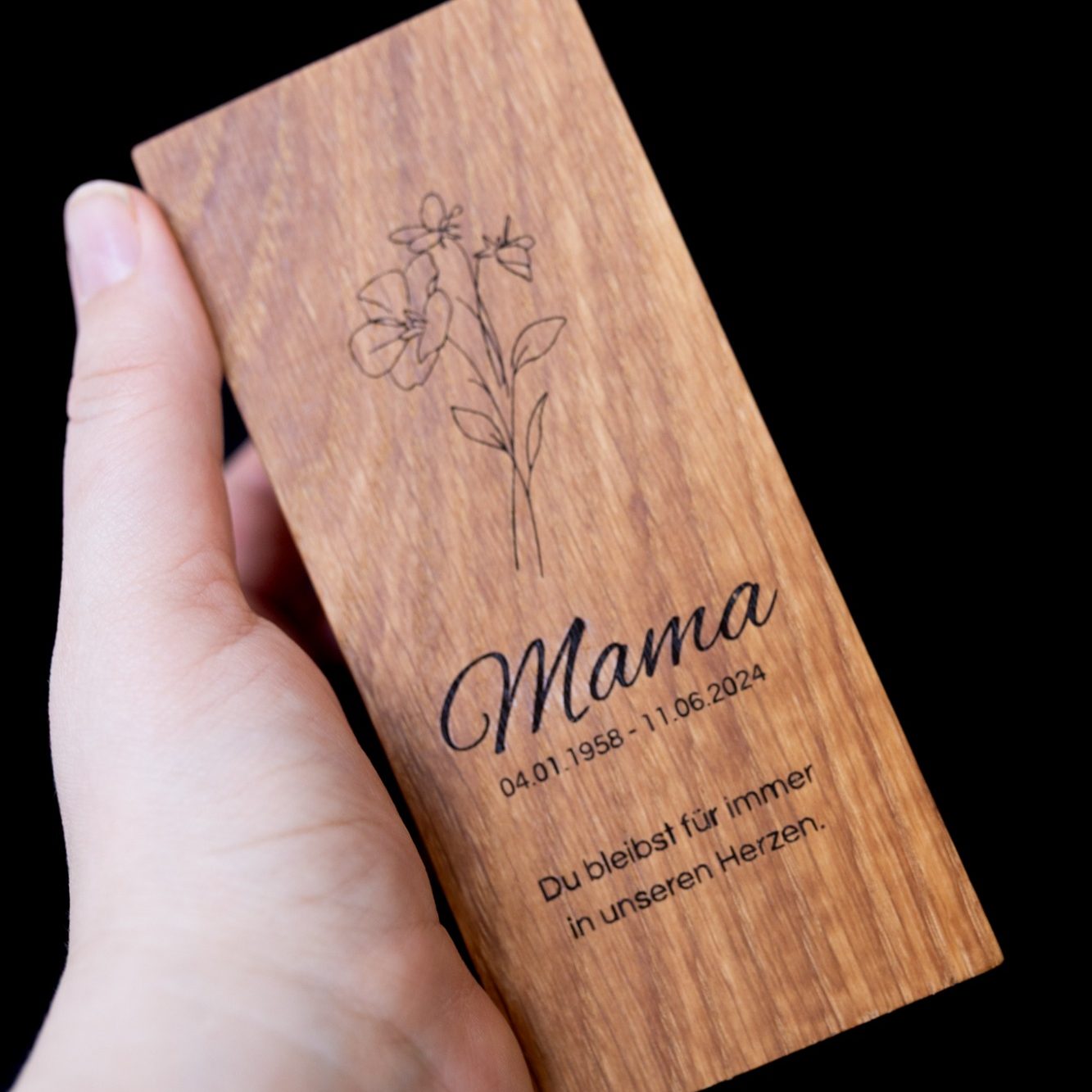 Unsere elegante Gedenkurne aus Eichenholz inkl. persönlicher Gravur.